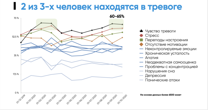 Мы изучили более 6500 анкет на протяжении года и увидели самые характерные симптомы. На графике видны всплески тревожности в феврале-марте и сентябре-ноябре. В эти периоды 2 из 3 человек (60-65%) отмечали, что испытывают тревогу. Всплески панических атак тоже есть, в марте и октябре их число выросло примерно в 1,5 раза. Примерно также дела обстоят и в корпоративном сегменте. Это значит, что к финансовому кризису во многих отраслях добавляется еще и психическая нестабильность в коллективе.